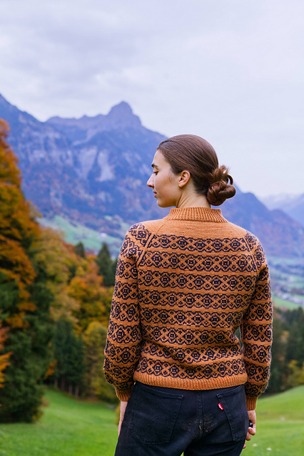 Worked from the top down with compound raglan shaping, the Beechnut Sweater features an intricate but easily memorizable colourwork pattern.
