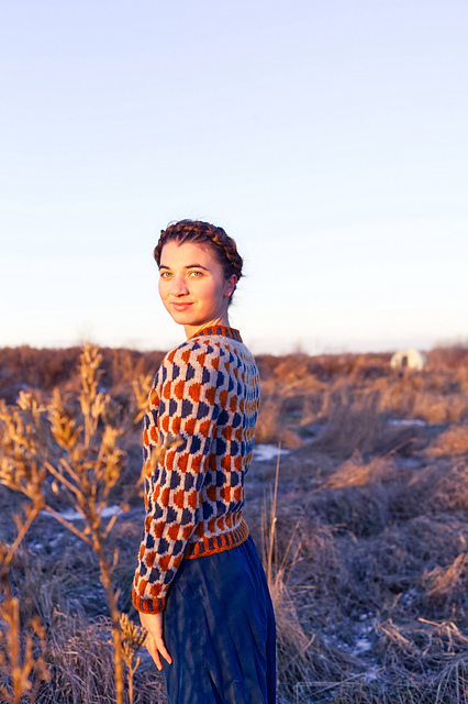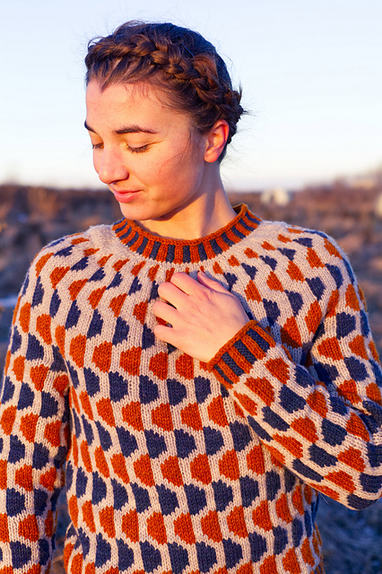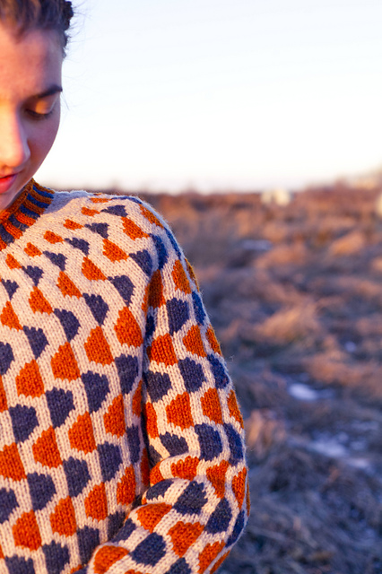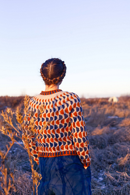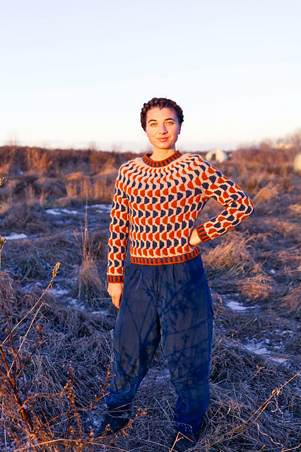 Knit in the round from the top down, Wax & Wane features a Bauhaus-inspired half moon motif. This pattern incorporates underarm shaping to give the traditional round yoke construction an improved fit.