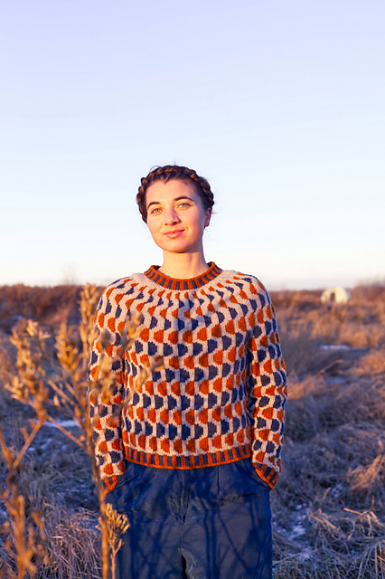 Wax & Wane is knit from the top down. After casting on and joining in the round, short rows are worked to raise the back neck before beginning the colourwork yoke. The yoke is knit to a given length before marking body and sleeve stitches and working underarm shaping. After dividing for body and sleeves, the body is knit to length and finished with a two-colour corrugated rib hem. Sleeve stitches are picked back up and the sleeves are decreased slowly until the cuff. Finally, neckline stitches are picked back up to work corrugated ribbing to finish the neck.